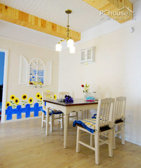 这个餐厅背景其实很简单,一个小小的窗户框架,加上一些手绘的夏日图案,顿时给人一种很有feel的田园风。