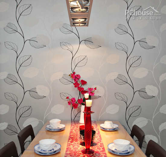 本来壁纸部分的铺贴会特别的抢眼,花纹壁纸是最有意境的,如果您需要的是一个意境的话,可以选用比较素的底色,比较粗线条的花纹,使得餐厅背景看起来有意境,但又不会显得十分的凌乱。