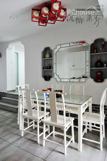 在客厅的另一则就是开放式的餐厅。餐厅的一大亮点则是充满中国风格的八边形图案作为背景墙。还有中国红的吊灯。