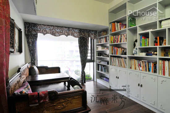 而另一边的小起居室就以家居收纳为主题,大型的书柜好好地发书籍收藏好。充分利用立体空间,让家居收纳更加出色。