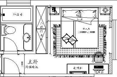 主卧设计:原先窗台是有一个长形的书桌,现在把书桌去掉,床的位置移向窗台,在卫浴间这边加一个整体衣柜,至于书桌的位置,就设计在电视机旁边。