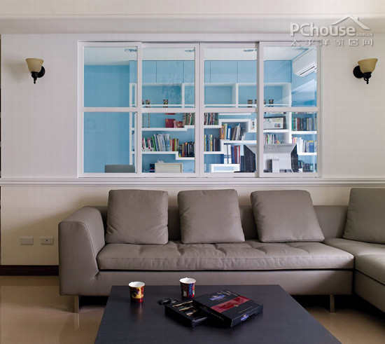 客厅的电视背景墙确定在主卫方向,沙发背景墙确定在书房方向,客厅和书房之间用透明的钢化玻璃作为隔断,书房里面安装百叶拉帘保证隐私,改善了书房和客厅的采光,同时还省去了沙发背景墙的装修预算。可伸缩的沙发床就为家里来客人时考虑,可做客房,平时又可以作为一个休息区。