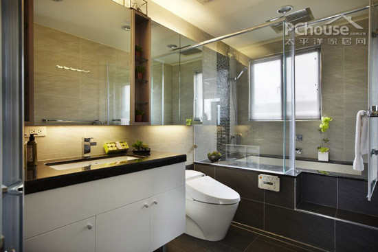 主卫设计:把原本主卧门口的储物间一块改成,卫生间的干区,摆放洗手盘和收纳柜,湿区摆放的是大一些的洗手盘、浴室柜、左侧以及淋浴房。同时在过道处还作了一个嵌入式的收纳展示设计。