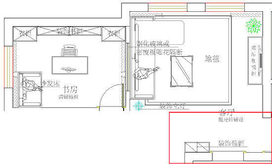 4、同时,设计师还给出了2个客厅书房方案:一个摆放可变形沙发床、另一个是作地台设计。