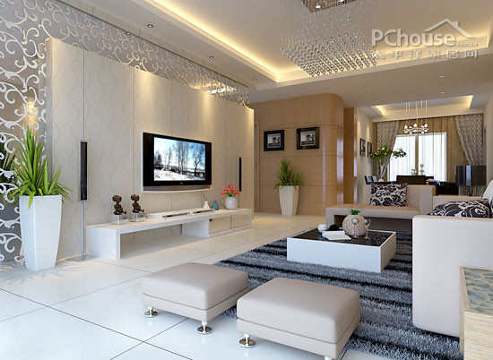 客厅参考:客厅采用的简单温馨的设计,运用比较浅的色调,营造轻松现代的氛围。电视背景推荐用贴花镜面,具有时尚感。