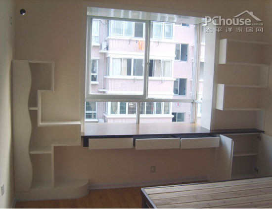 儿童房窗台参考:儿童房就充分利用飘窗的位置,做一个书桌和简单的书柜,摆放床和衣柜就宽松了不少。
