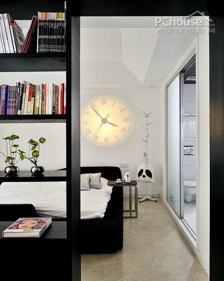 用书架隔开两个空间感觉就能把睡眠和工作隔开在相对独立的空间上。在床头墙上的时钟设计,不仅实用还可以起到装饰效果。(案例供稿十上装饰)