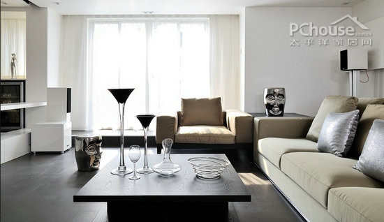 一进门口就是宽敞的客厅设计。落地的窗台显得客厅格外宽敞明亮。配上浅色的布艺沙发和黑色的茶几。这样一黑一白的交错体现了时尚之感。