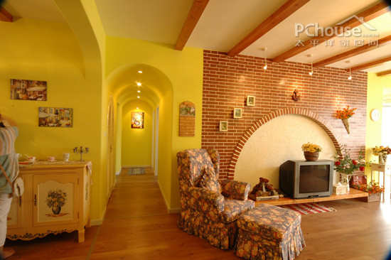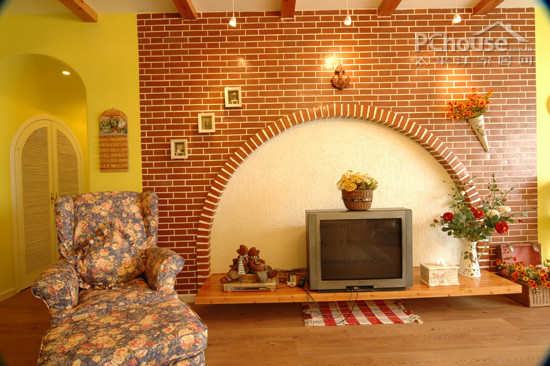 红色砖块的电视背景墙设计,也是很自然的设计手法,怀旧的设计也令家居设计总体更自然。墙上的花束和相框也是装饰了背景墙。