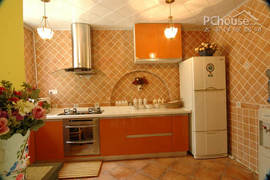 厨房线性的交接,墙面地面和橱柜采用了不用纯度的橘黄色,利用纯度不同,达到变化不至于单调,整体性又颇强。