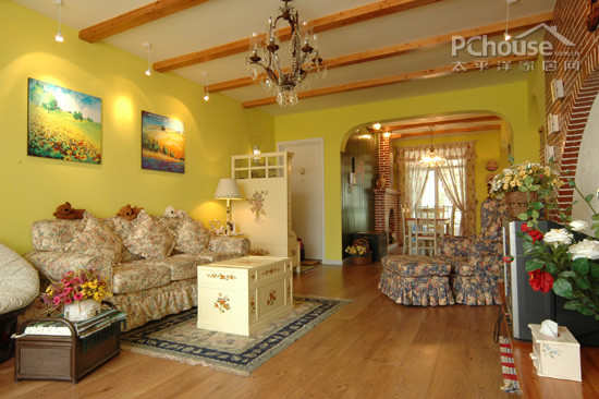 天花采用木条装饰,显得自然。沙发墙上的挂画是广阔的田野风景图,加之明亮黄色的承托,整个空间很有朝气。
