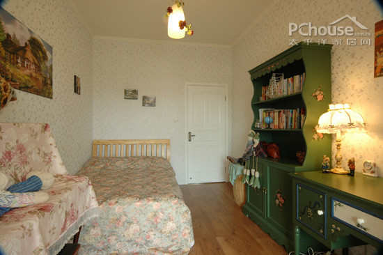 碎花的壁纸设计,清淡淳朴,搭配上周围同样是碎花的被单和碎花的布罩,加强了主题。绿色的书架和书桌搭配上简单的一台小台灯,儿童房的设计果真自然,极具乡村气息。