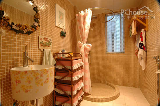 马赛克遍布的卫浴,设计师细腻地采用了花卉装饰的镜子,有花纹的洗手台,整个卫浴也是粉色的设计。黄宗泽胡杏儿的恋情也有这么美好的时刻,粉色的,另人心悸的美好。