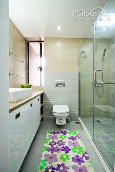 卫浴设计采用玻璃分隔开来,比较有层次,但不失情趣。其他地方采用高出台面的洗手盆设计,也颇显现代气息。