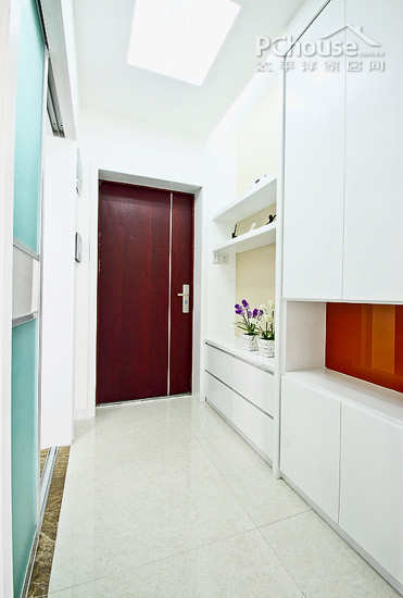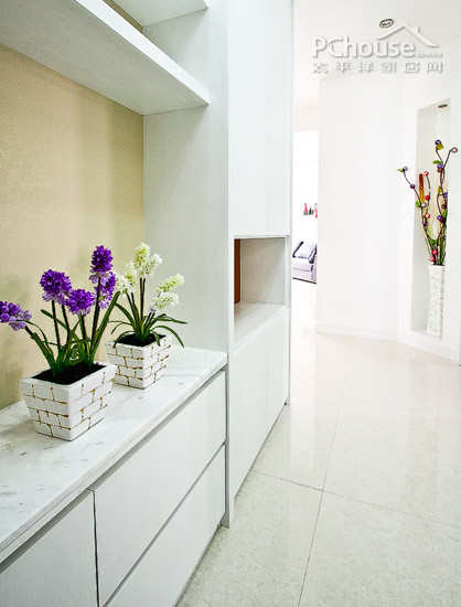 简单的玄关设计以洁白色的家居收纳柜为主,门口旁的小花整天了整个设计的活力。