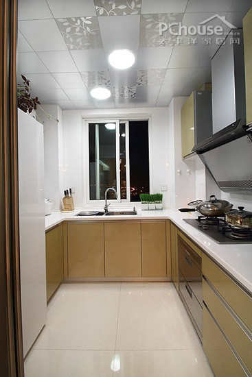 简洁的厨房,空间感强。使用新型的抽油烟机能比较节省空间同时也能让油烟对厨房瓷砖的影响减少。采用木式的下柜,简洁大方,持久耐用。