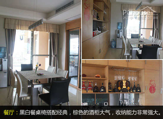 编辑点评:黑白餐桌椅搭配很经典,餐厅的设计亮点在于酒柜的设计,棕色的酒柜大气,而且收纳能力非常强大。
