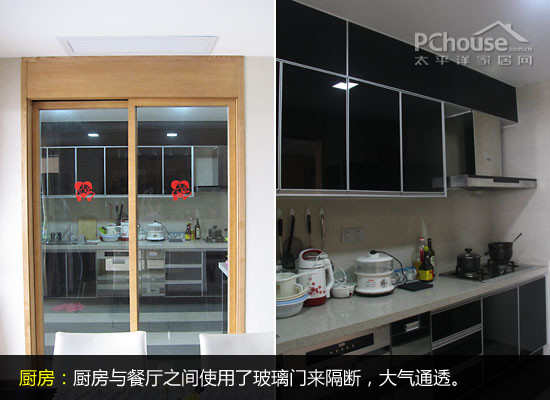 编辑点评:厨房与餐厅之间使用了玻璃门来隔断,大气通透。厨房整洁干净,现代化的橱柜功能强大,使用方便。厨房家电俱全,黑色的橱柜耐脏,搭配乳白色大理石台面,耐看实用,并且容易打扫清理。