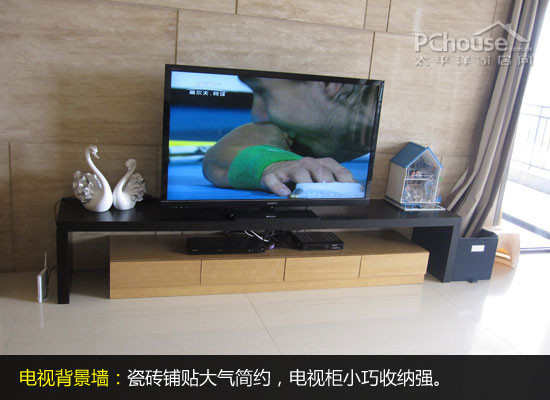 编辑点评:电视背景墙是由瓷砖铺贴而成,与地板砖相互呼应。电视柜小巧简洁,节省空间,电视柜桌上的装饰物成双成对,洋溢了浓浓的爱意和喜庆。
