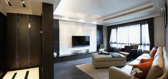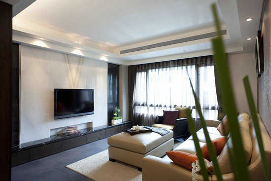 转个身,磅然大器的电视墙映入眼帘,设计师特别挑选冰晶白玉大理石少有的线纹做V字拼花造型,凸显其尊容之气息,同时也将电器线槽与视听器材做了完整的处理。