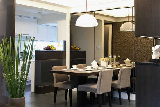 深灰色的意大利进口砖铺设公共空间的场域,立体分割的大面茶镜,以不锈钢拉丝做镜面边框,配合橱柜系统与玄关高度,放大了整体的空间视觉。