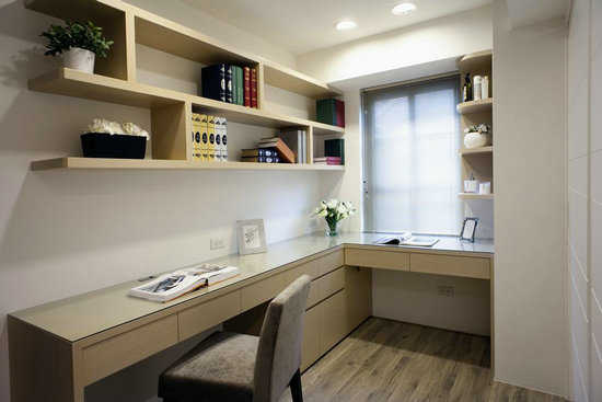 书房是以两人可以同时使用的空间作设计,现场木工订作的L型书桌,让小小空间有了最大坪效的发挥,同时也规划了轨道式拉门储物间,满足女主人放置大型储物的需求。