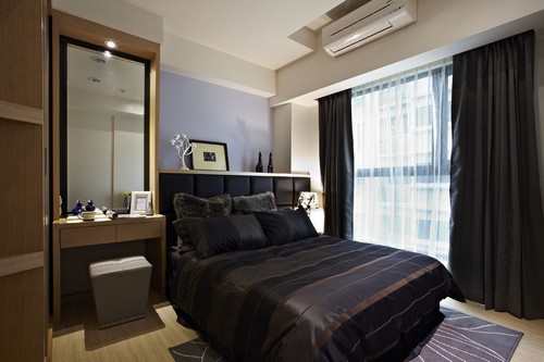 主卧室设计师以半包覆式的工法框出卧房的主墙,加厚床头板巧妙化解了床头压梁的问题,并运用包覆的空间于床头两侧设立隐藏收纳。