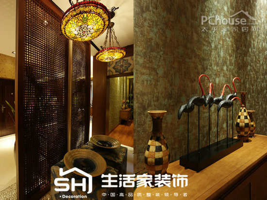 东南亚风味的餐厅设计和厨房设计相连通,古朴的图画和摆设都透露出不一样的异国风情。