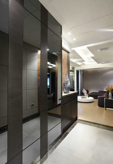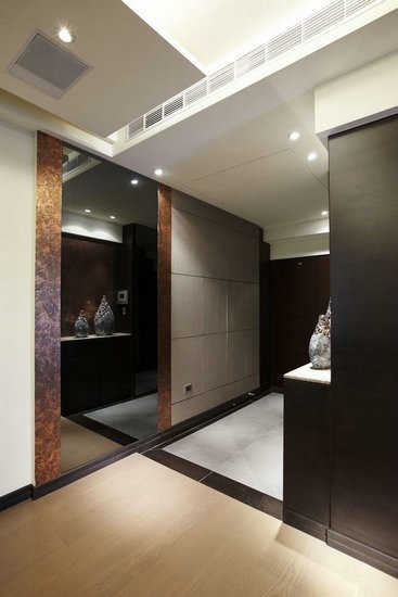 玄关处灰镜延伸出的大器,加上贴木皮材质,高雅质感提升到水岸会馆层级。