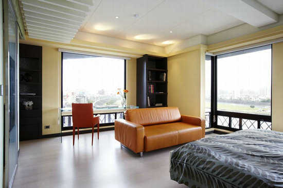 近一百八十度、十二米厘厚的玻璃窗景,彷若玻璃屋之姿,将屋主读书、躺卧甚或发呆的神情,融入变幻莫测的景致,即便一个人在家也不孤单。
