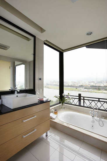 让人连卫浴时刻也不舍错过的河岸景观,主卧卫浴中,泡澡区落出大面窗景,同时镜面也将风景带入室内,无死角的视野,贴近着大自然的脉搏。