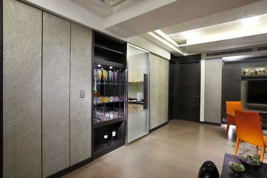 男主人的水晶杯收藏,在阳光下反射出熠熠鑚泽,一旁打上雾面的玻璃金属拉门,推拉之间兼具着阻挡厨房油烟及保护展示柜的功能。
