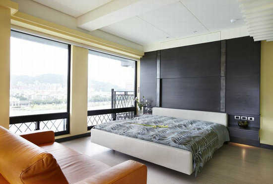 大片留白的墙面刷上绿色,部分天花板以格栅将冷气隐身,融合出大自然氛围。床头精心规划了升降式电视门,让屋主可于睡前坐在床尾沙发,享受悠闲时刻,而皮革混搭上金属光泽石英砖拉出的线条,隐晦出另一番低调奢华。