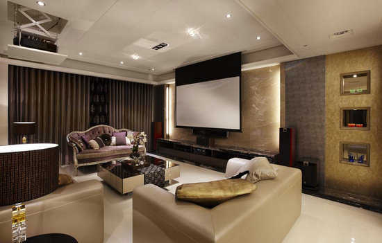 在天地之间设计师周靖雅,巧妙运用电动升降投影机牺牲的高度,规划出天板造型,线板花与勾缝语汇,倾诉出轻古典质感。