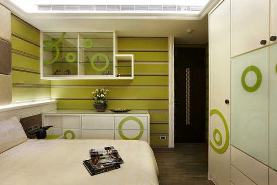以绿色基底的普普风,因应小朋友的习惯,在电视柜里加装了拉板,可以将电视拉出来近距离观看。