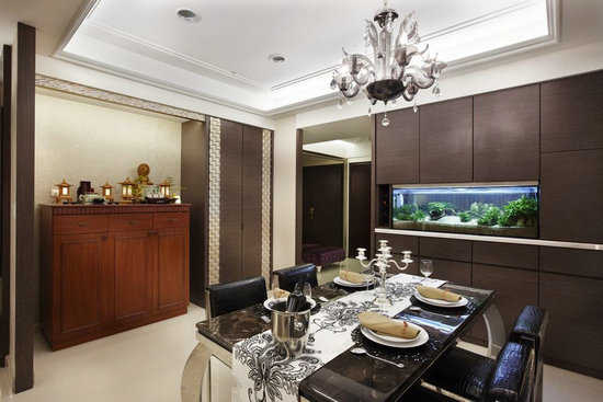 以烤漆处理拼起带有光泽感的华丽主墙,菱网格线条让空间更显精致,吊挂一盏主灯饰,围塑优雅的用餐氛围。