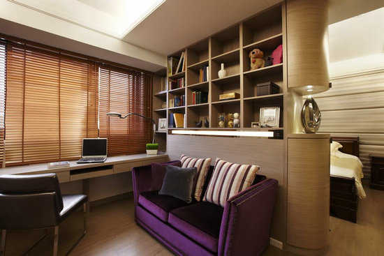 位于主卧房内的起居空间,同时结合书房与更衣室的功能,影音墙面往左延伸大面积的衣柜收纳,具丰富的机能性。鲜艳的双人沙发让起居空间多了休闲气息,也是屋主最喜爱的区域。