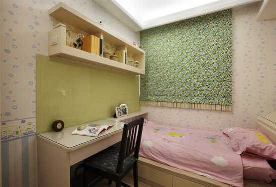 喜欢樱花女孩,设计师在柜面与天花板都设计入樱花图腾,墙面也选择粉色系,朵朵花开的图腾壁纸,烘托出女孩般的粉嫩气息。