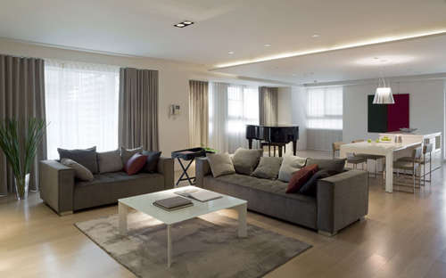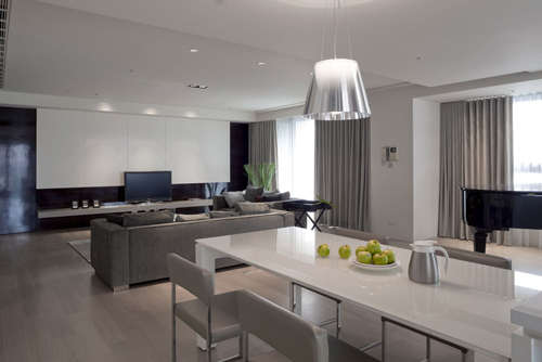 设计之初,设计师洪淑娜便把封闭的隔间全数拆除,以一墙之分切割开阔的公领域,并依家具划分空间属性,包含客厅餐厅厨房及钢琴演奏区,各自延展宽广的视野;尤其巧妙运用穿透式材质,在玄关导引出其余空间的存在,精采地创造视觉深度。