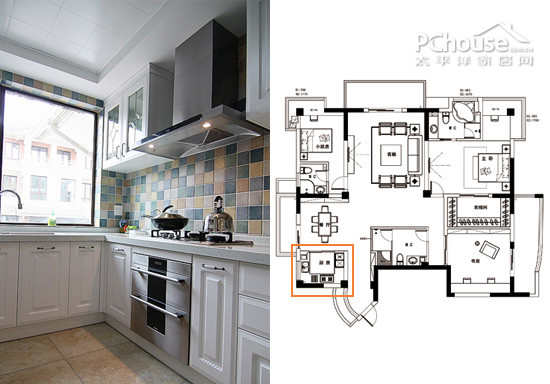 厨房采用U型格局,用玻璃门作为与餐厅的间隔,对于田园风格的厨房,灰白的瓷砖加上马赛克的装饰作用,就可以打造出清新的田园风。