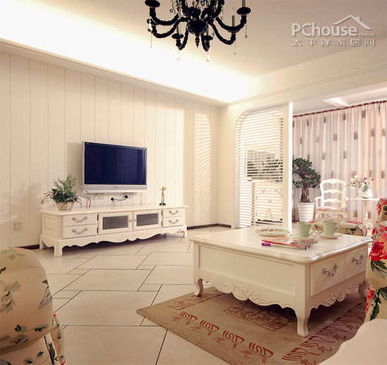 凸显出沙发区的田园气息,靠坐在这里,如浴春风。沙发背景的壁纸也配合田园主题,十分夺人眼球。