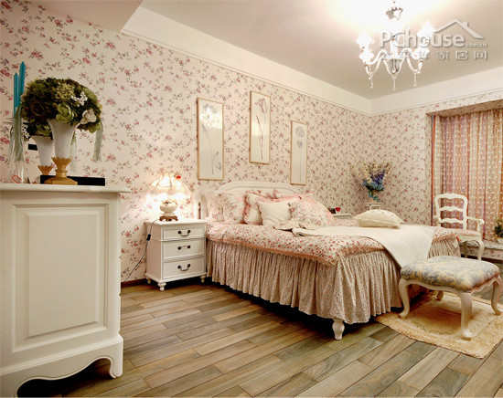 床头背景采用田园式墙纸,不需要太多的装饰,更能体现网友的追求。