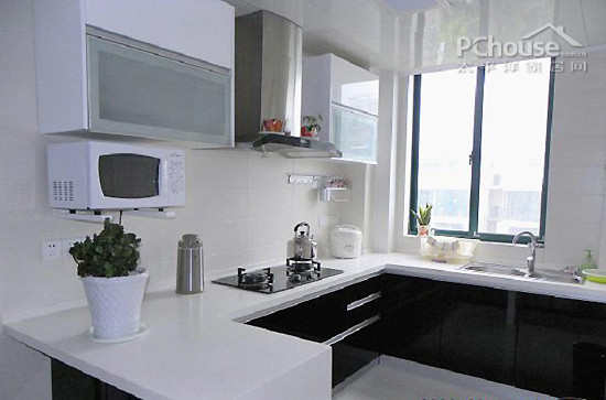 厨房设计:厨房部分以高光黑白调子为主,干净整洁,颇具现代感。