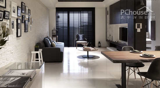 客厅设计:客厅以块面和线条装扮空间,大面积的木制作和白色,是其特有的特色.