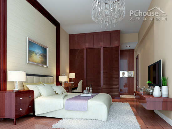卧室设计则以实用美观兼顾为主。大型的衣柜满足主人对家居收纳的要求,电视墙设计更是简约又实用。