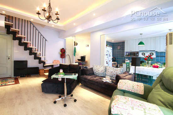 客厅的用色颇为丰富,绿色就有三种之多,但并不觉得繁乱。客厅的惬意不仅来自原木纹的地板、大地色和草绿色相间的沙发、浅色家具和欧式吊灯,单看那一圈暖暖的灯带就让人倍感温馨。