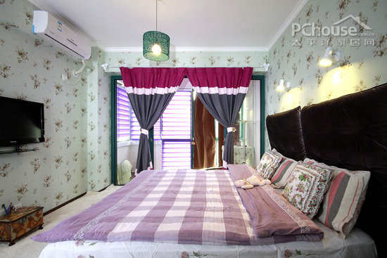 主卧以淡紫和淡蓝为主基调,整个空间沉浸在一种舒适的氛围里。紫色的床品和窗帘将整个主卧包裹在如梦如幻的梦境里,碎花墙纸是田园风格的首选,绿色的镂空吊灯是卧室的点睛之笔,与原木床头柜相映成趣。