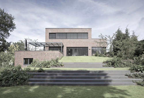 这座住宅坐落在一座小山丘上,俯瞰着雷西林根这座小城。雷西林根是德国西部的一座小城,靠近科隆。住宅外形精巧,用料简单,和周围的普通住宅形成一种鲜明的对比。大面积的场址让住宅主人拥有一个宽阔的生活空间,住宅总楼层面积为600平米。住宅立面使用手工砖。大窗户设计让住宅融入到周围的绿色环境之中。