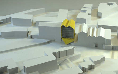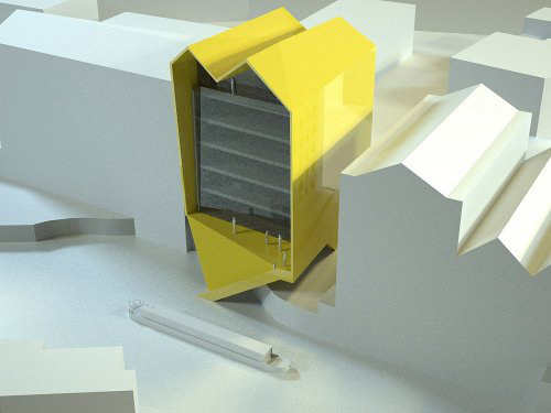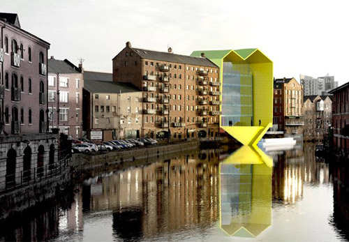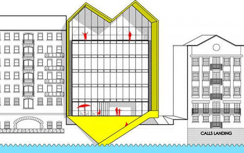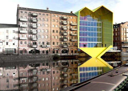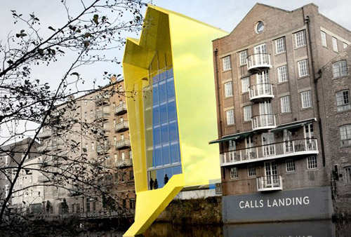 屋顶锯齿状天际线隐喻周围海边的建筑物,但鲜亮的黄颜色让新建筑有了流行和时代的意味。建筑与地面接触的方式很有趣,似乎是浸在水里,不同于周围的建筑,上了台阶有休息停留的空间。靠河处可以停靠驳船,成为运输节点,在未来可以沿河旅游。