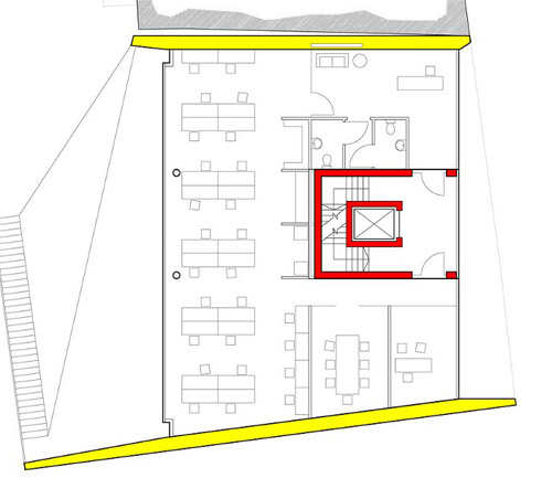 设计有四个要素:黄色皮肤,玻璃箱,地板和核心。P+H事务所解释道:明亮醒目的黄色皮肤外观,作为表面“标志性”包装,并以此将建筑置于周围的环境中。